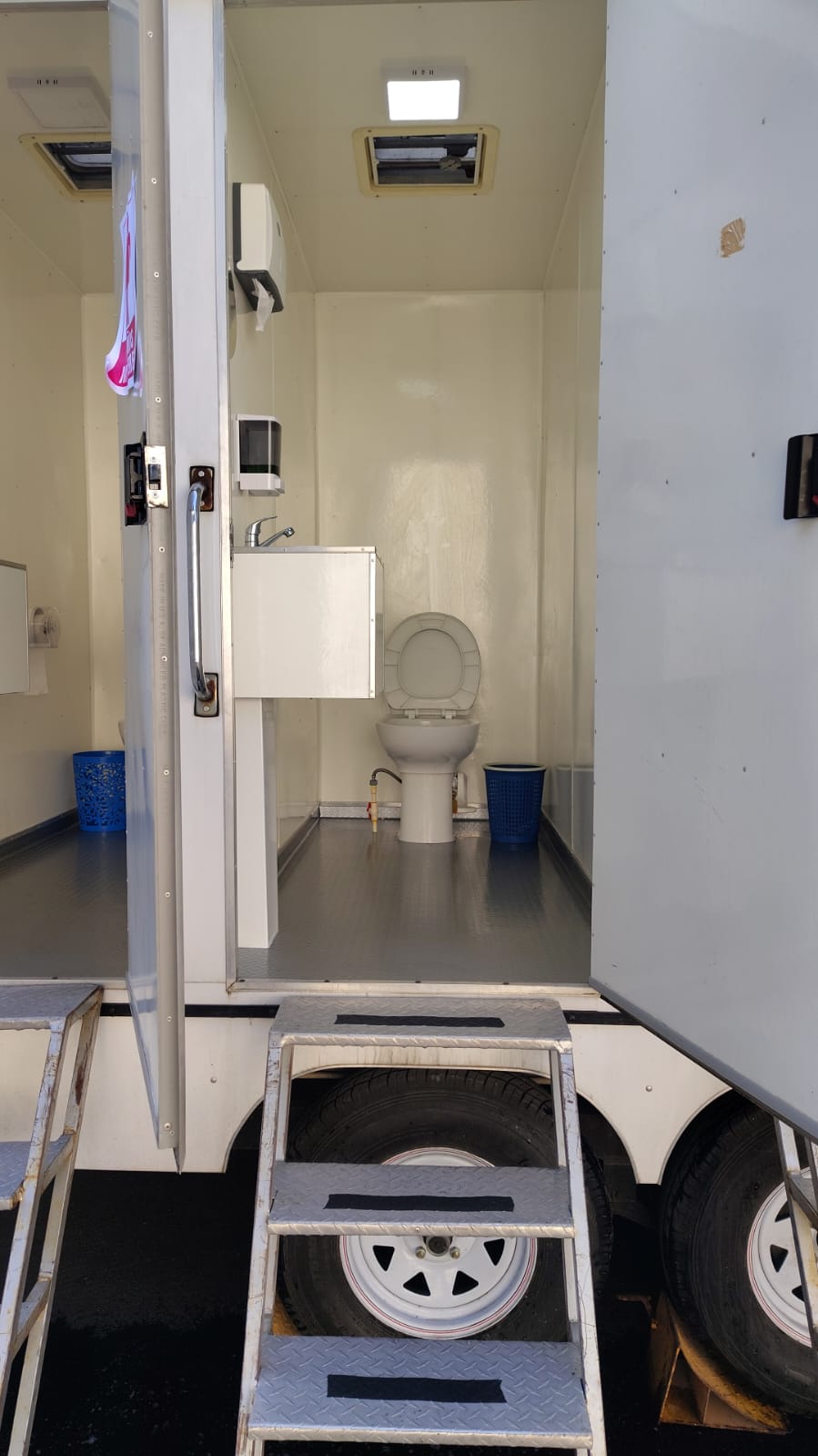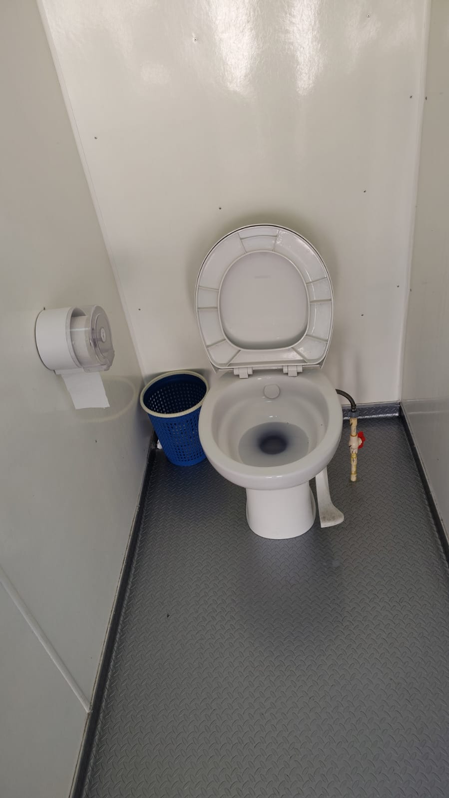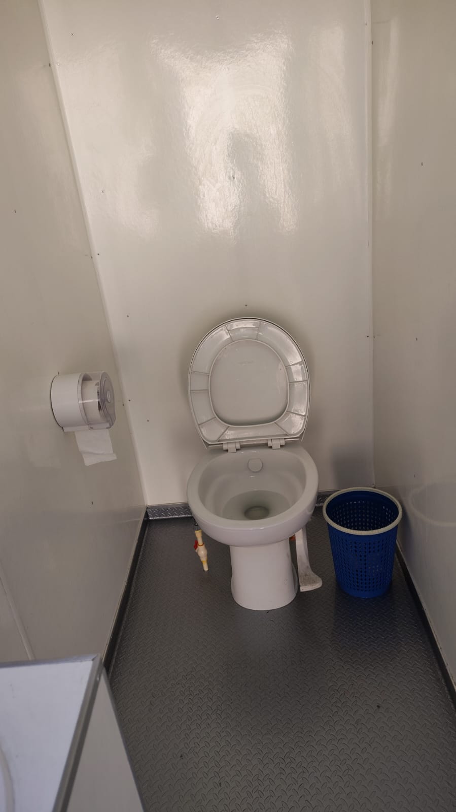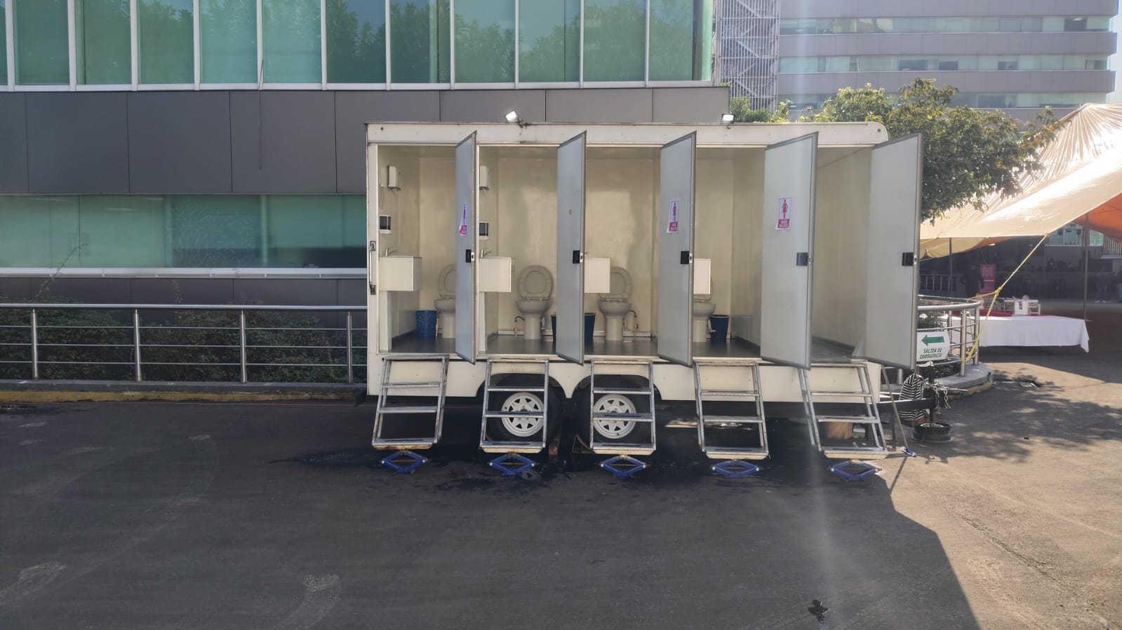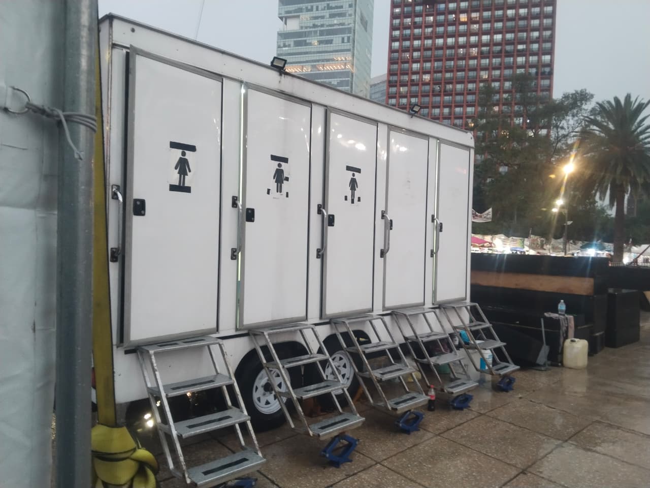- 3 W.C. para mujeres - 2 W.C. para hombres - 1 mingitorio - 2 Lavamanos - Luz interna y externa - Espejos - Papel Higiénico - Despachador de papel y toallas para manos - Botes de basura - Pasadores indicadores (hombre / mujer) - Escaleras de acceso - Sistema Flush - Domo para control de malos olores